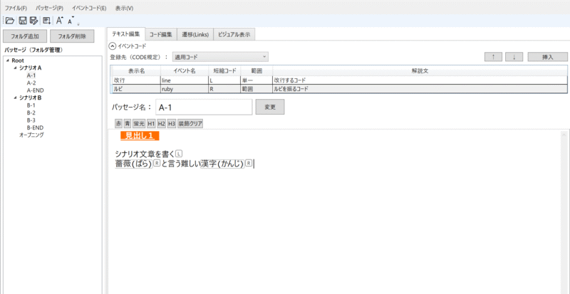 「テキスト編集」タブが、主にシナリオを書くメイン画面になります。