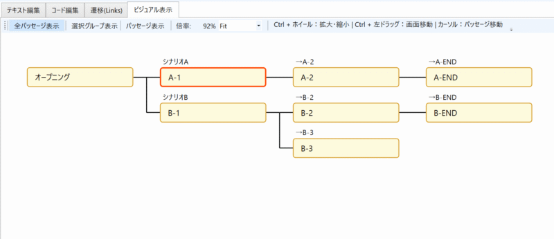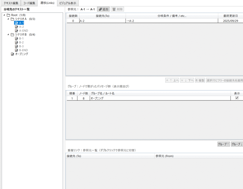 テキスト同士の遷移や、分岐の繋がりを登録する箇所になります。