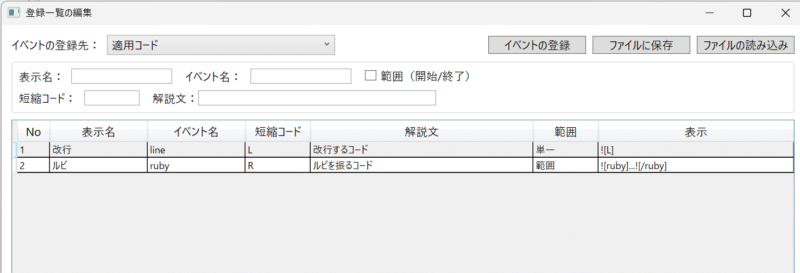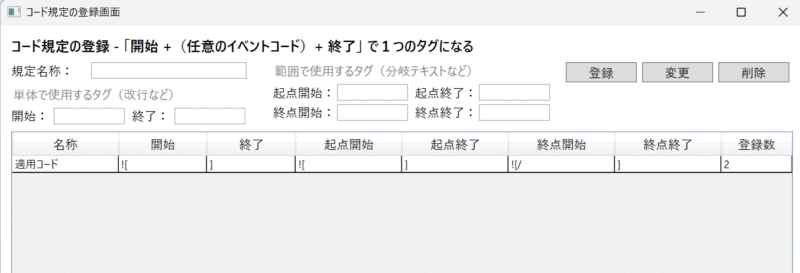 こちらは、ゲームで使用するタグを登録管理する「コード規定」画面になります。
